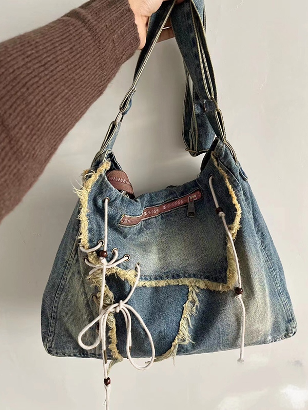 Bolso bandolera Y2K de mezclilla con detalle sin rematar, cremallera y lazo en la parte delantera