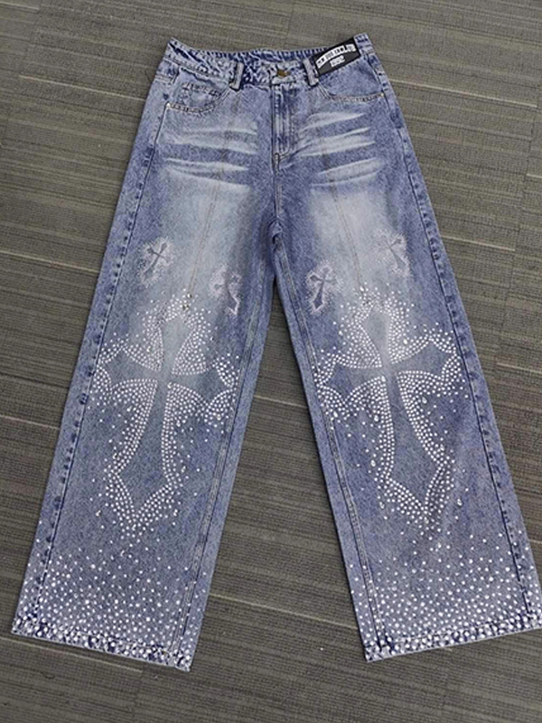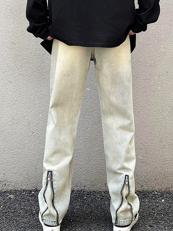 Vaqueros de pierna recta con estampado de bordado colorido lavado para hombre
