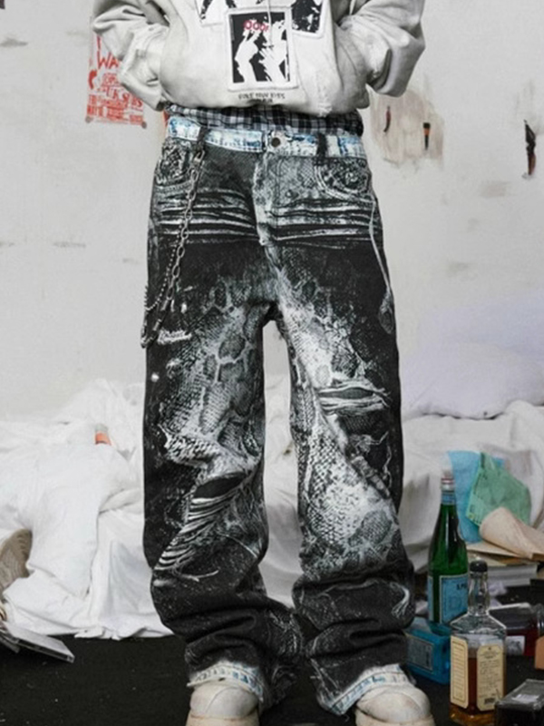 Vaqueros boyfriend con estampado de leopardo y copos de nieve y manchas de moho