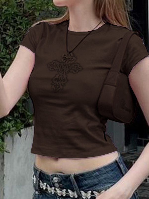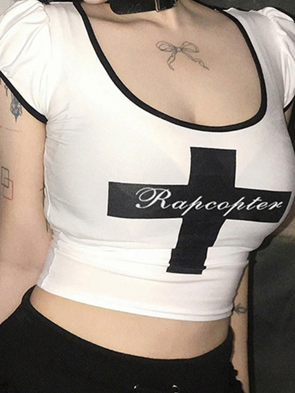 Camiseta de manga corta con estampado de letras cruzadas y mangas abullonadas