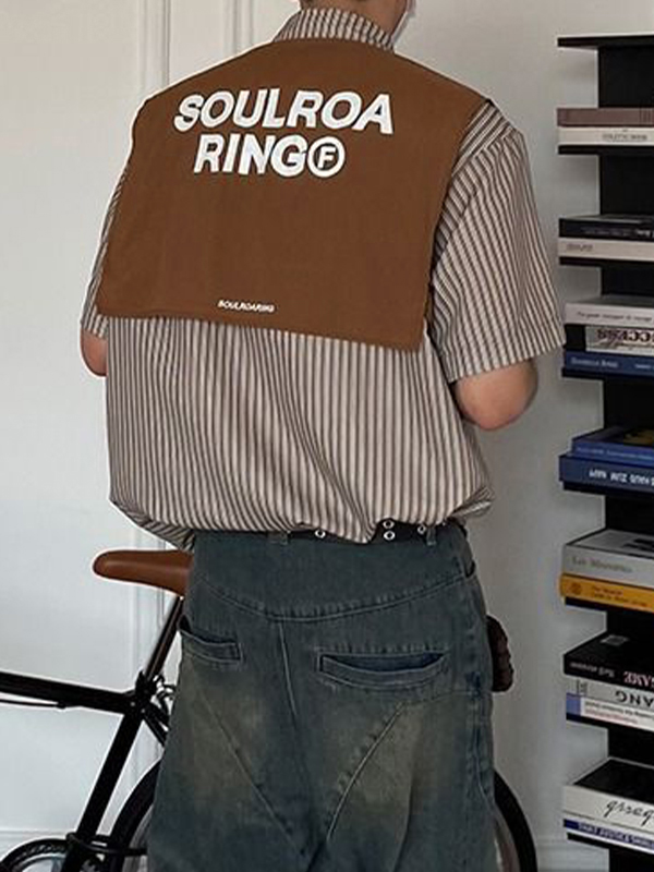 Blusa de manga corta de dos piezas falsa con chaleco de empalme a rayas para hombre