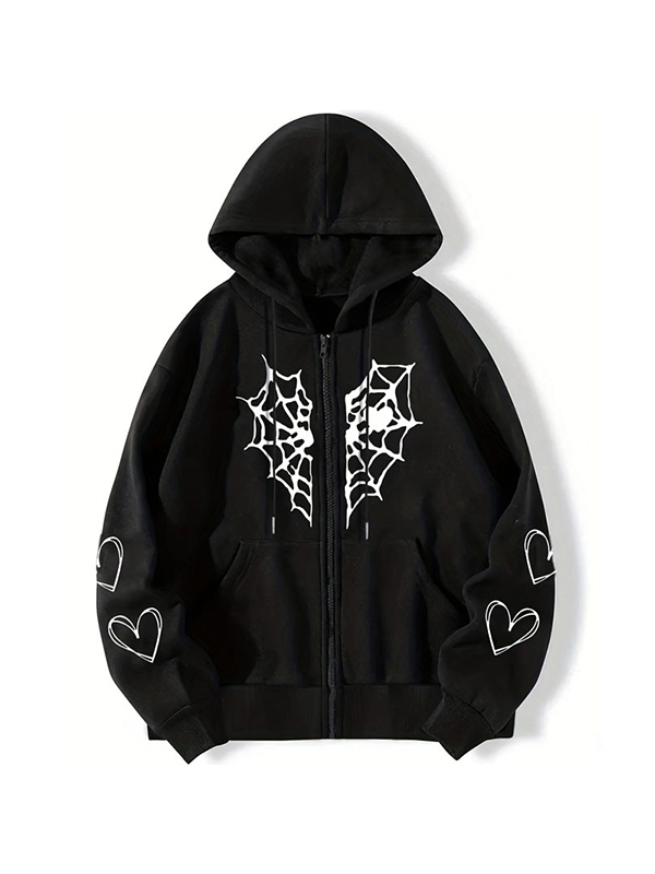 Sudadera con capucha extragrande con cremallera y estampado de telaraña en forma de corazón para hombre