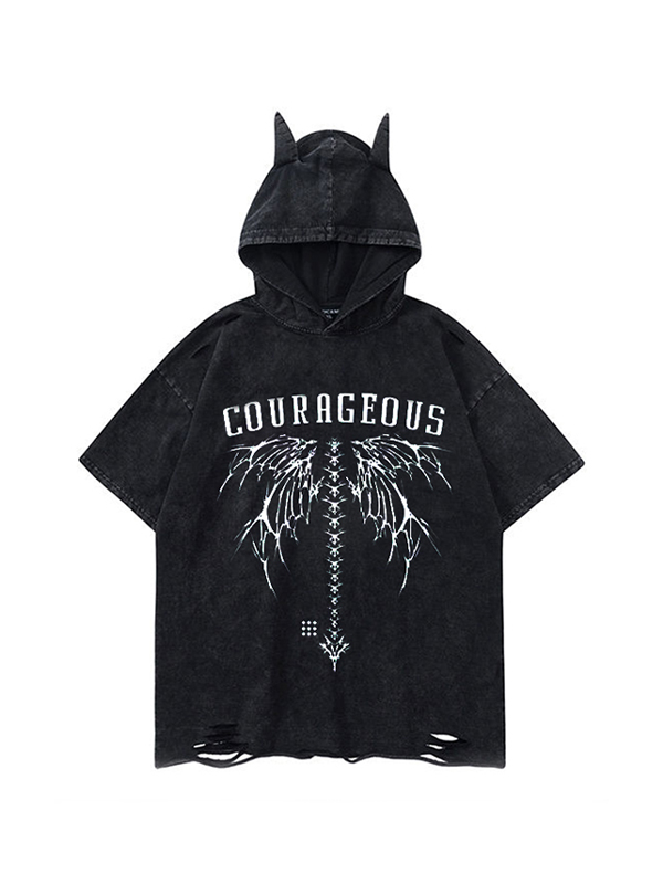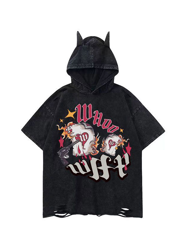 Camiseta de manga corta con capucha y dobladillo desgastado con estampado desgastado para hombre