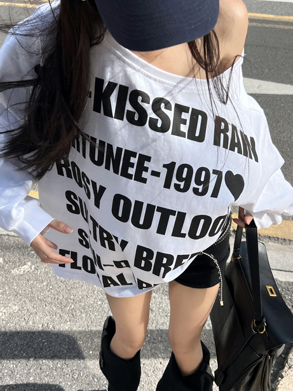 Camiseta de manga larga holgada con hombros descubiertos y estampado de letras