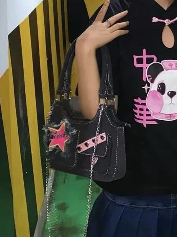 Detalles: estos bolsos de hombro para niñas incluyen un estilo de correa de hombro de cadena larga, presenta una estrella de fray desgastada y una letra bordada, paneles con diseño de bolsillos en la parte delantera, tiene detalles de costura en contraste y un dije de corazón adornado.