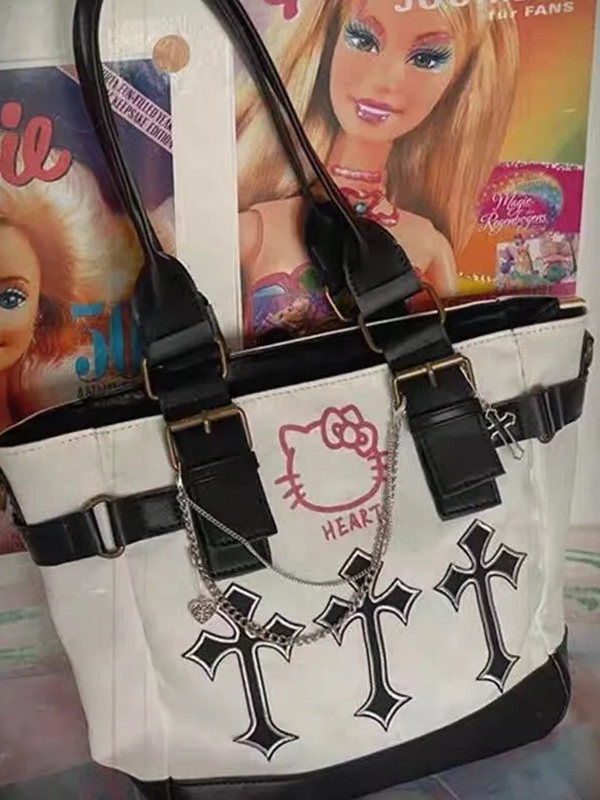Detalles: Este estilo retro El bolso tote para niñas tiene adornos de cadena de metal, cuenta con una cruz bordada y un diseño estampado de dibujos animados.