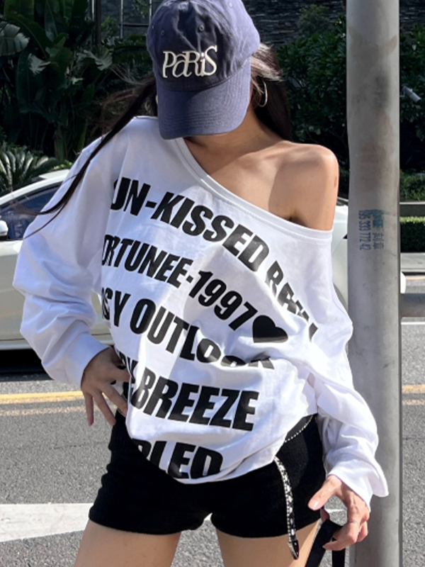 Camiseta de manga larga holgada con hombros descubiertos y estampado de letras