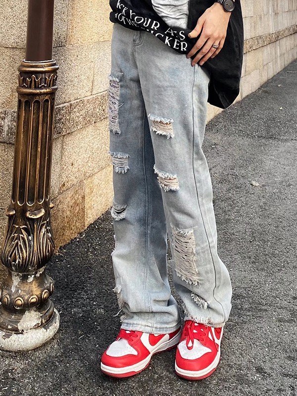 Descripción: Estos jeans envejecidos con forma de calce acampanado en el tobillo, presentan agujeros rasgados deshilachados y Detalle de parches con estampado de cachemira, cierre de botón con cremallera y diseño de bolsillos funcionales.